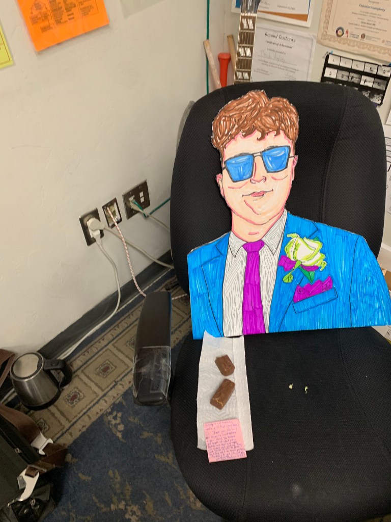 First of all, some of the good things: my wife came back to work at my school again this year. That is one of the best things that could ever happen, because my wife is my favorite person in the world; every time I get to see her at work, it makes my day better. This year I got to ride in to work with her every single day. I got to walk her to her classroom. I got to help her with tasks at school. When she left (Early in the day, because she only worked part time, exactly as she wanted to), she would usually stop by my classroom to say goodbye; it made my morning better, every single time. It’s also good because my wife is an excellent teacher, and I’m happy for the students who got to take her classes; even though not all of them appreciated it. She’s coming back next year, but with an even better schedule, because for the first time in her five years of teaching (Not counting her years of work as a sub, or her summer school experience, or the internship program she helped run and the computer skills class she taught as part of that program — want to know why she’s an excellent teacher? Because in addition to being a brilliant and sensitive and honest person, and in addition to knowing every single little thing about her subject, she has a ton of actual experience teaching. Unlike the administrators who give us our performance evaluations every year. BUT ANYWAY.) she will not be teaching middle school students who are all shoved into a mandatory art class that most of them don’t want. It’s awful to try to teach a subject to someone who doesn’t care about it and so doesn’t care if they learn or not, or if they pass or not; it’s especially tough when you love the subject and know the great value it can bring to lives, as my wife loves art, and as I love English.