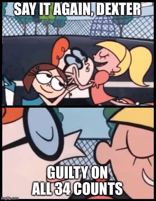 But the point here is that I don’t really understand the legal maneuver that the DA used in this case. Not that it was bad, or that it made the verdict bad; just that I don’t understand it, and therefore I don’t like it. Using the same gut-feeling level of decision making, I will say that I believe in my gut that Trump absolutely committed this crime; maybe he shouldn’t have been convicted of it, and maybe he shouldn’t have been convicted in this way — but if he got away with this, that would be a miscarriage of justice.